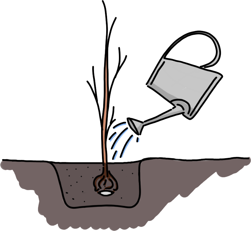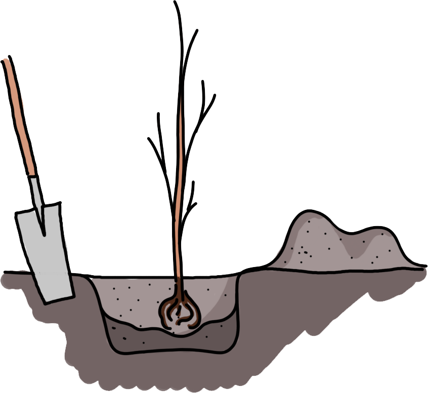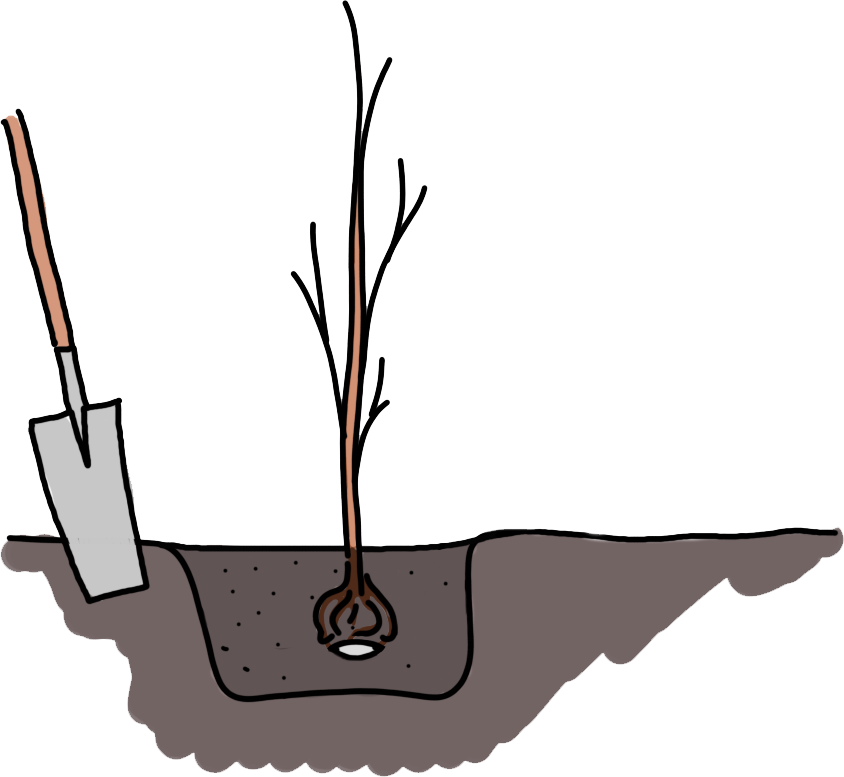 Doe zoveel grond terug in het plantgat totdat de plant even hoog staat dan eerst. (zie verkleuring op de stam net boven de eerste wortels).